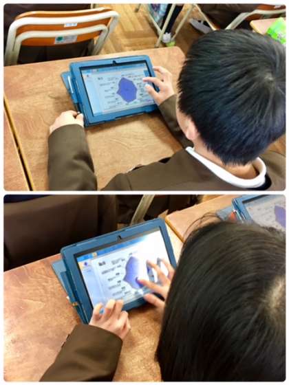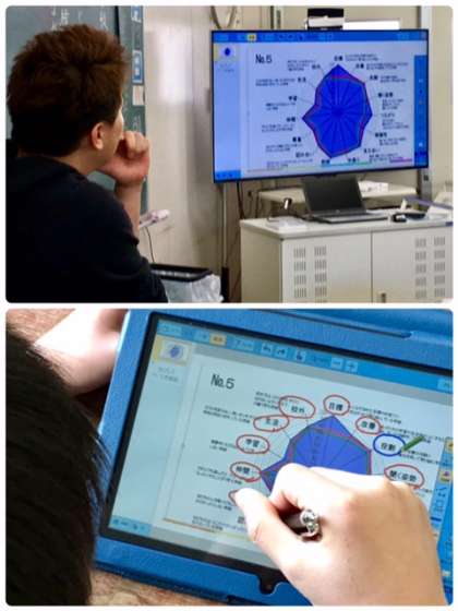 子どもたちのアンケート結果をタブレットパソコンを使って、坂田先生から子どもたちに配付されました。グラフを見て子どもたちが自己を分析します。