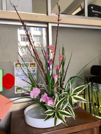 おはようございます。今月も校長室前に生涯学習ルームの生け花教室の皆様が、春の花を生けてくださいました。