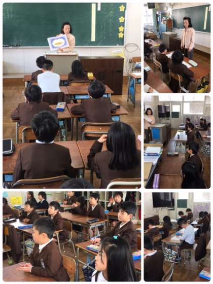 5時間目の大阪市教育センター教育指導員の吉川さわ子先生の示範授業は2年2組で行われました。国語科の授業は、あまんきみこ作の絵本「きつねのおきゃくさま。」の読み聞かせです。2年2組読書タイムでは担任の若松先生からたくさんの絵本を読み聞かせしてくださっています。今日は「お話で すきなところと そのわけを 書いて はっびょうしよう。」をめあてにした授業です。