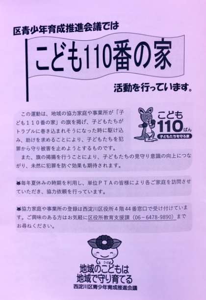 主催の西淀川区青少年育成推進会議とは、行政はもとより、家庭と地域社会・学校園等が連携し、「大阪市次世代育成支援行動計画」にかかる施策を総合的かつ効果的に推進し、区民一人一人の意識高揚を図ることを目的に、こども・青少年の健全育成、生命と安全を守るための活動として、子ども110番の家事業や啓発活動に取り組んでおられます。