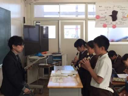 6年1組の音楽の授業の様子です。全体でソプラノリコーダーの練習をしたあと、三好先生に聞いていただいています。どの子もよく練習した成果を聞かせてくれました。