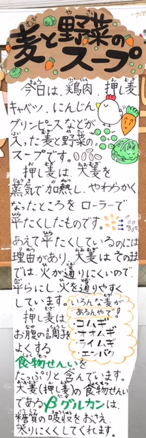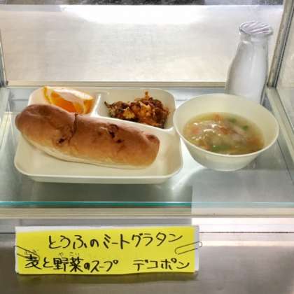 さて、今日の献立は、豆腐のミートグラタン、麦と野菜のスープ、レーズンパン、デコポン、牛乳です。