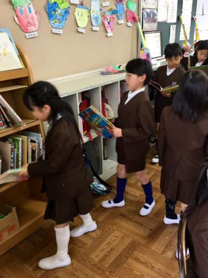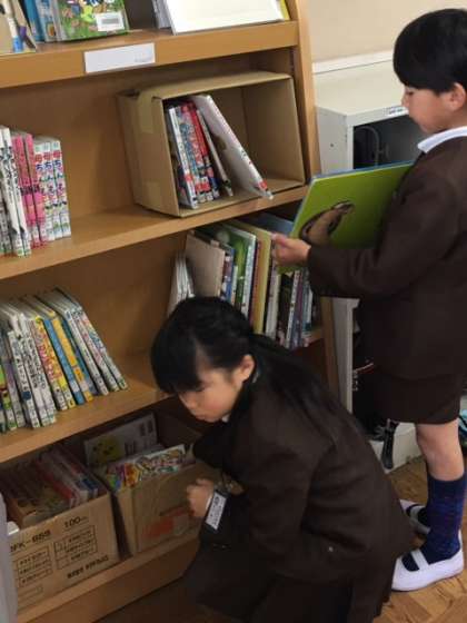 2年1組の教室に参観した時には、読書タイム終了のチャイムがなり終わってしまいました。子どもたちは学級文庫に本を返却していました。名残惜しく返却を待つ間も本から目が離れません。