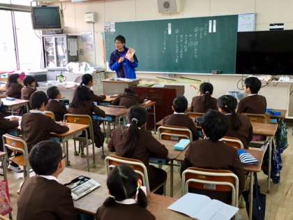 3年1組の読書タイムの様子です。田中先生が読み聞かせをしてくださった後、本の内容について子どもたちに問い掛けて、読書を深めています。