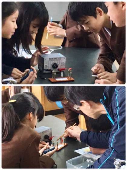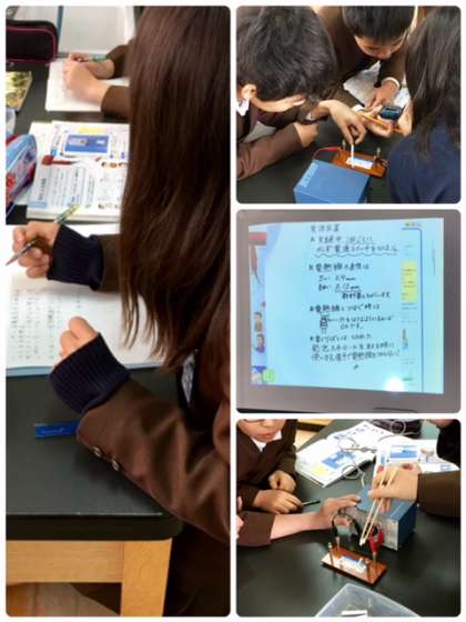 単元「発電と電気の利用」の学習です。今日の授業は小山教頭先生がしてくださっています。実験に際して子どもたちは、今まで学習してきた事柄をもとに、予測をたてます。そして班ごとに実際に実験をして検証します。