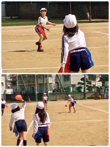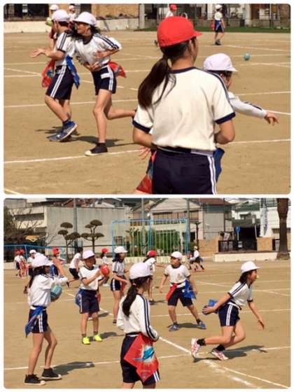 4年1組が体育で、タグラグビーの練習をしています。必死でボールを追いかけて楽しそうです。