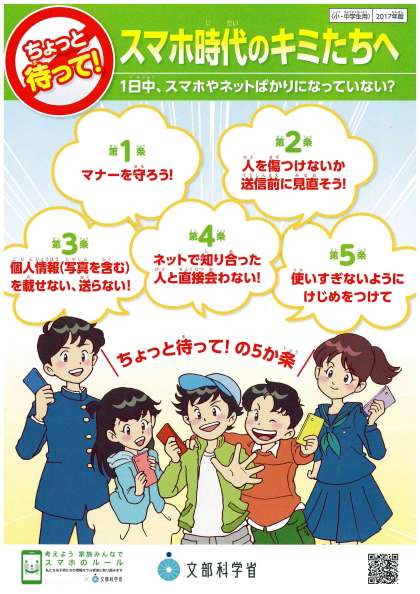 文部科学省より、「スマホ時代のキミたちへ」のリーフレットが届きました。保護者の皆様に参考にしていただきたく紹介します。