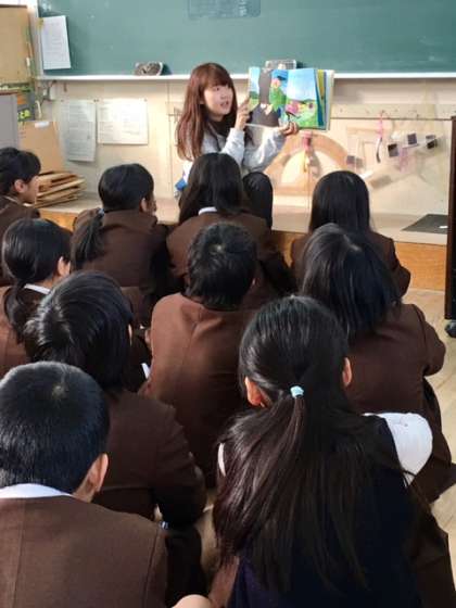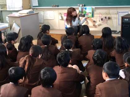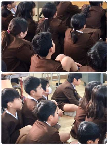 5-2の読書タイムは先生のまわりに集まって、福間先生が読み聞かせをしてくださっています。