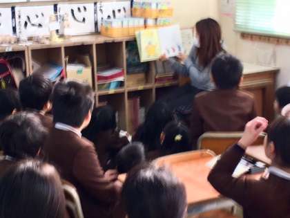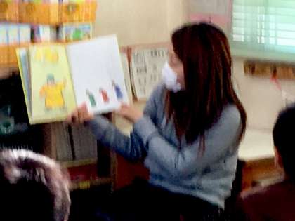 担任の依田先生が読み聞かせをしてくださっています。子どもたちは良く集中して話を聞いています。