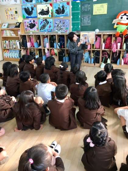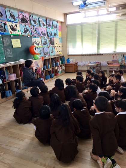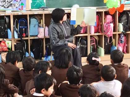 今日も、教室の後方に集まって守島先生に本を読んでもらっています。