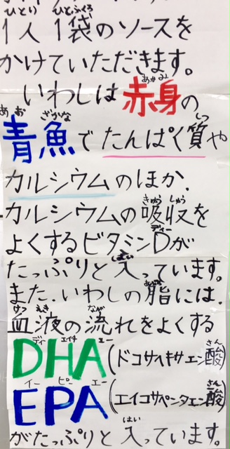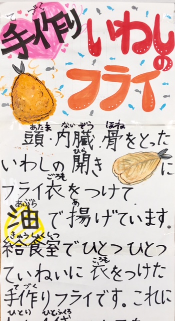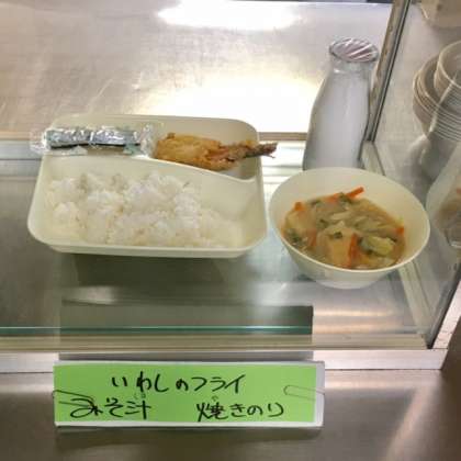 さて、今日の献立は、イワシのフライ、味噌汁、焼き海苔、ごはん、牛乳です。