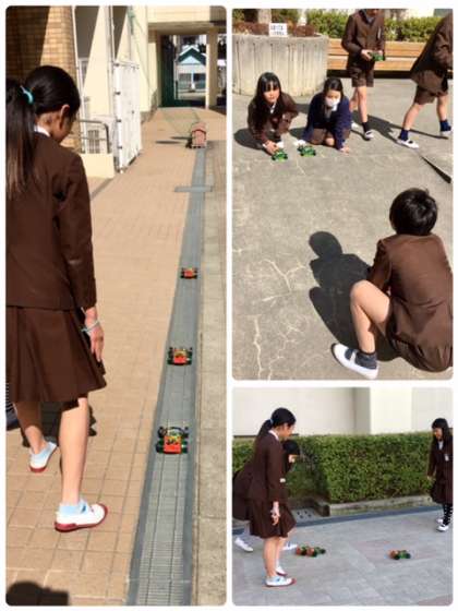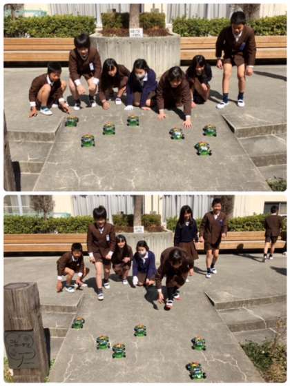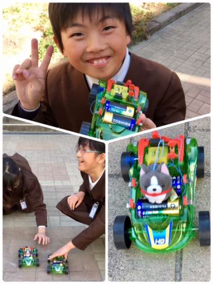5年1組の理科です。電流の学習をして、それぞれがニクロム線を巻いて、モーターをつくり学習をしました。まとめに電池で走る車を組み立て、中庭で走行させています。