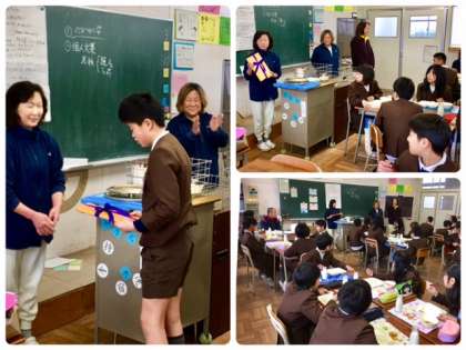 給食の時間に給食調理員さんが教室を訪ねて来られました。卒業記念に大和田小学校で人気の給食レシピカードをプレゼントしてくださいました。