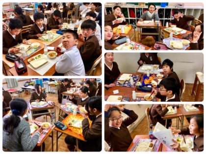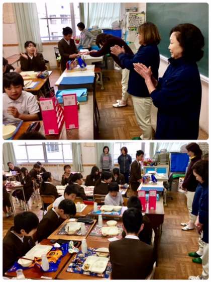 6年1組、小学校生活最後の給食です。子どもたちは和やかに給食を食べています。