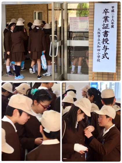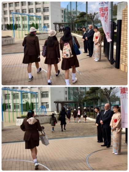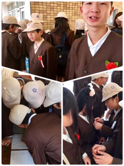 6年生は5年生に玄関前で胸花をつけてもらいます。どの顔も晴れやかです。