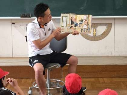 4年1組の読書タイムです。担任の石倉先生のまわりに子どもたちが集まって話に聞き入っています。