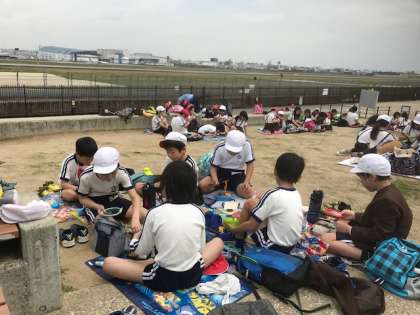 しっかり遊んだ後は、お待ちかねのお弁当です。みんな残さないで食べられたようです。お菓子も食べて、楽しい時間を過ごしました。お日様も顔をだして、暑いくらいでした。