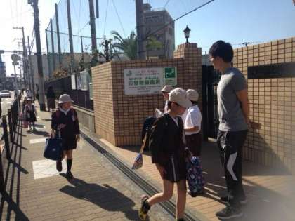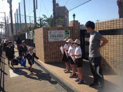 運営委員が、正門、通用門で、朝の登校時間帯に、元気よくあいさつをしています。