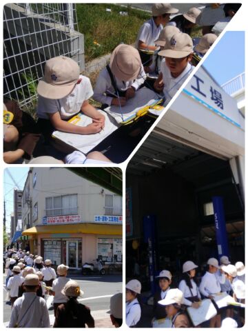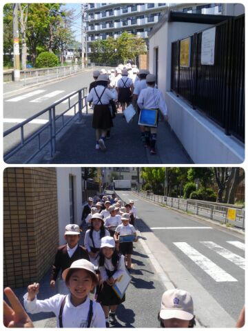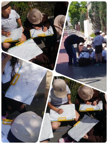 今日は、調べ学習で実際に校区内を探検しました。方位を確認しながら、白地図に記号を書きこんでいきました。