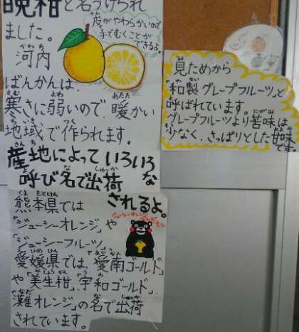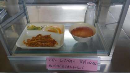 さて、今日の給食は、カレースパゲッティ、キャベツのひじきドレッシング、河内ばんかん、こくとうロール、牛乳です。