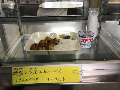 牛肉と大豆のカレーライス、レタスのサラダ、ヨーグルト、牛乳