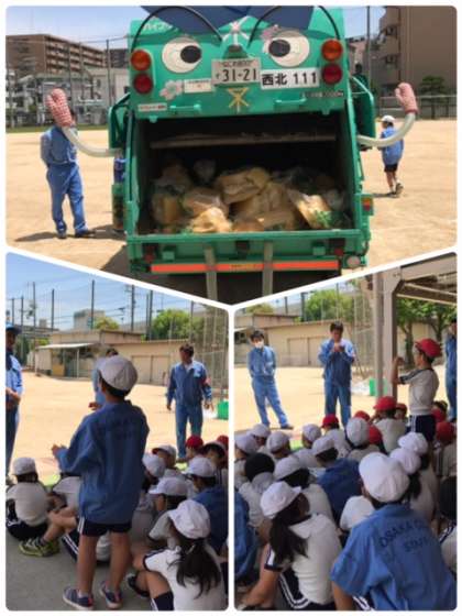 環境事業局の制服を着せていただいたり、実際にパッカー車の運転席に座らせていただいたり、ボタンで音楽を流したりさせていただきました。クイズにもしっかり答えられました。