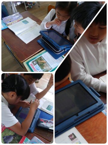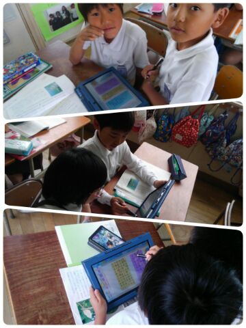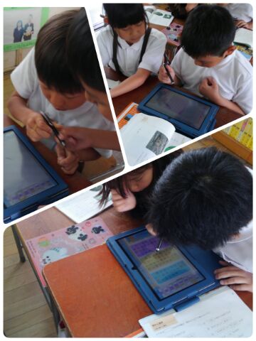 3年生の国語の学習です。今日は、形式段落ごとに、大事な文やことばを見つける活動をペアで話し合いながら、タブレット端末で行いました。