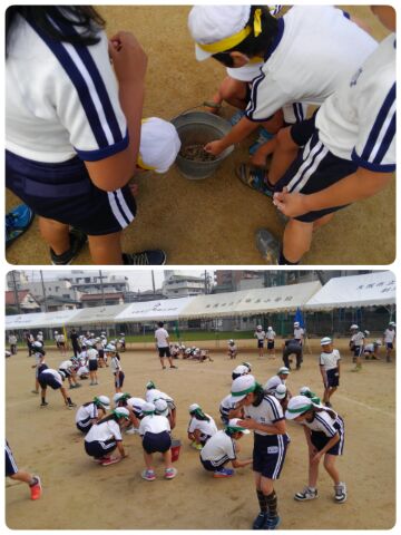 今朝は、運動会全体練習3回目です。まず、安全に競技、演技ができるよう全校児童、教職員で石拾いをしました。