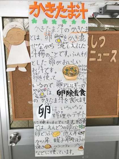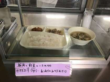 豚肉と野菜の炒め物、かきたま汁、あつあげの味噌だれかけ、ご飯、牛乳