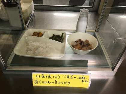 すき焼き煮、三度豆の胡麻酢あえ、焼きかぼちゃの甘みつかけ、ご飯、牛乳