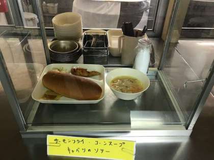サーモンフライ、コーンスープ、キャベツのソテー、あんずジャム、パン、牛乳