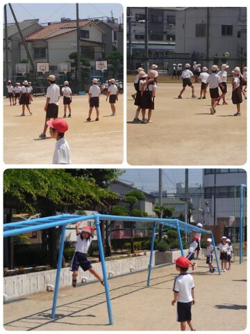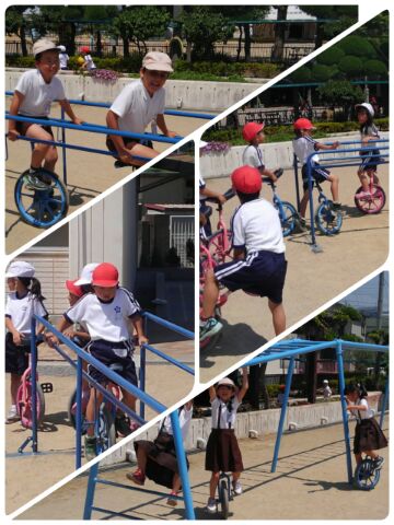 ボール遊びや、うんてい、のぼりぼう、一輪車、鬼ごっこと体を動かすことに夢中になっています。
