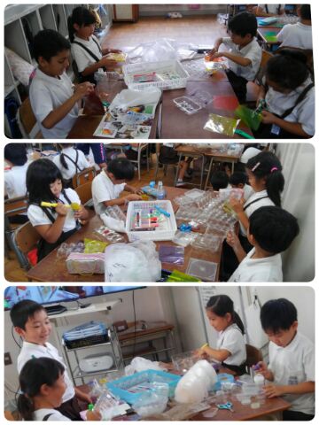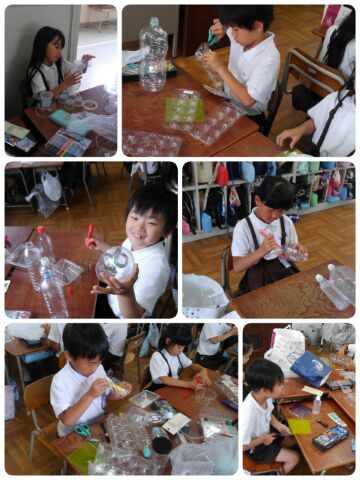 ひかりのプレゼント〜ふしぎな生き物たち〜をテーマに、2年生は、透明な容器にペンやセロハンを使いながら、カラフルな立体作品を作っていきます。