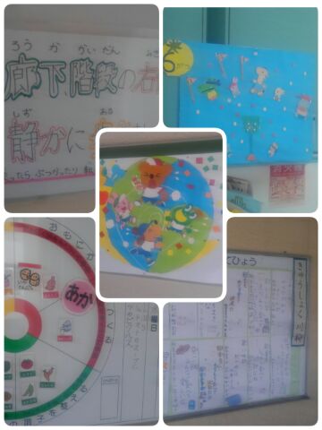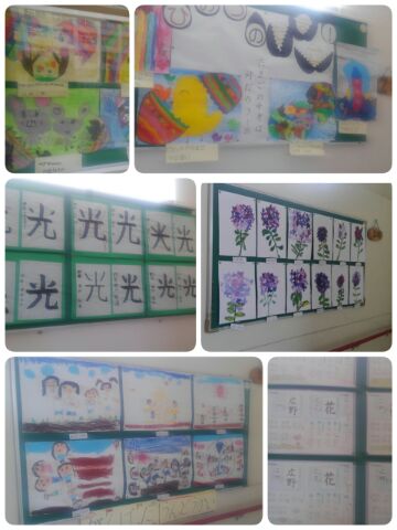 児童の頑張って仕上げた作品や、啓発ポスター、季節の掲示物など色々とあります。