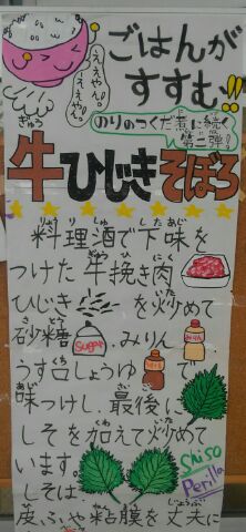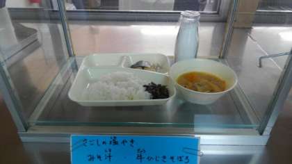 今日の給食は、さごしの塩焼き、みそ汁、牛ひじきそぼろ、ごはん、牛乳です。