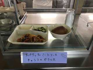 スパゲッティミートソース、きゅうりのピクルス、パン、牛乳