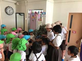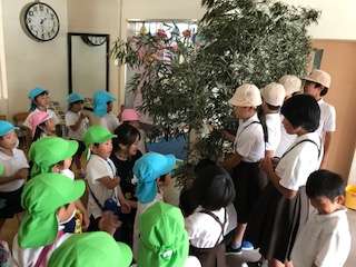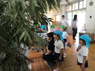 今年も小学校から大和田幼稚園へ、笹をプレゼントしました。1年生と6年生の代表で届けました。願い事が叶うといいですね。
