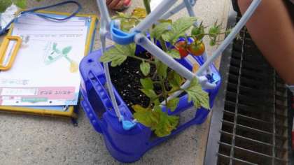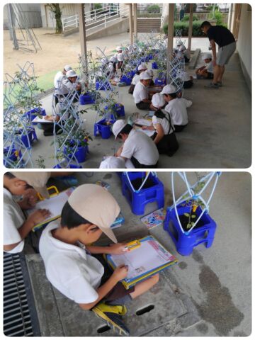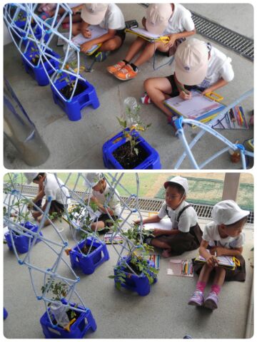 一人ひとりが育てているトマトの観察の場面では、ワークシートに実をかいています。