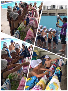 プールへの行き方、サンダルの並べ方、タオルのかけ方などを勉強しました。雨がたくさん降ってきてのでそこまででした。次は、シャワーの仕方も勉強して、大きなプールをもっと楽しめればと思います。