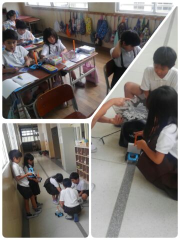 3年生が風やゴムのはたらきの学習で実験をしています。