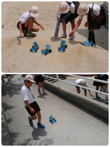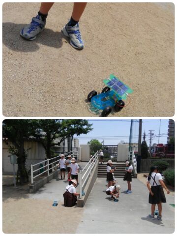 光の当たる強さや当たる角度を変えながら、光電池のはたらきについて学んでいます。