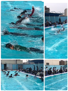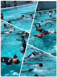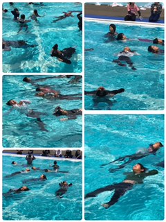 服を着たまま水の中に入るとどれだけ動きにくいか、どうやって浮けばいいのか、ペットボトルなど使えるのか、等を体験しながら学習しました。