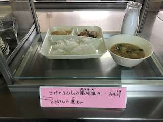鮭の山椒風味焼き、冬瓜の煮物、味噌汁、ご飯、牛乳