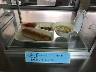 押し麦のスープ、夏野菜とベーコンのソテー、すいか、パン、牛乳