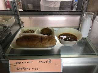 チキンレバーカツ、ケチャップ煮、たことキャベツのソテー、パン、牛乳