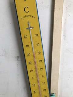 職員室前の温度計が34度を示しています。