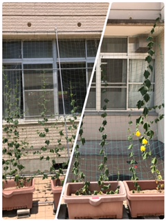 元気に伸びた、ひょうたんやヘチマも水を欲しがっています。