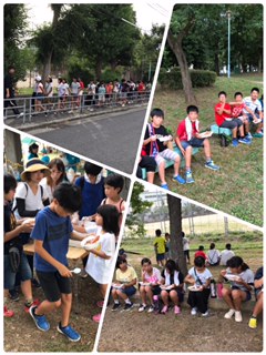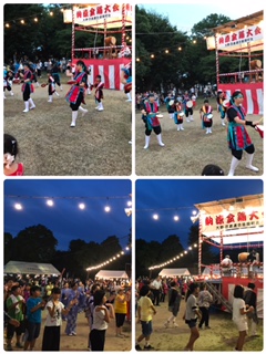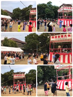 夕方から大野百島の盆踊り大会にみんなで参加。美味しいカレーをご馳走になり、その後盆踊りをみんなで練習。エイサーの皆さんの踊りを見た後、練習の成果を発揮して、みんなで踊りました。とても上手に踊り、盛り上がりました。