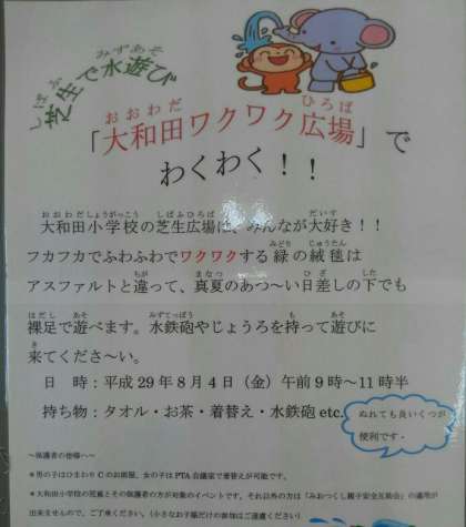 今度は全学年対象で、校庭芝生化実行委員会の皆さんが、大和田ワクワク広場で、水遊びをしませんか?という素敵な企画を立てていただきました。