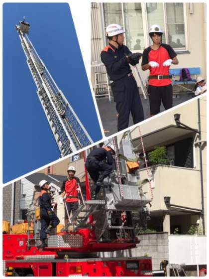 まずは、ハシゴ車の見学です。担任の林先生は消防署の方と打ち合わせをした後、実際にハシゴの高さを体験しました。子どもたちは、大きい声で担任の先生に声援を送っています。